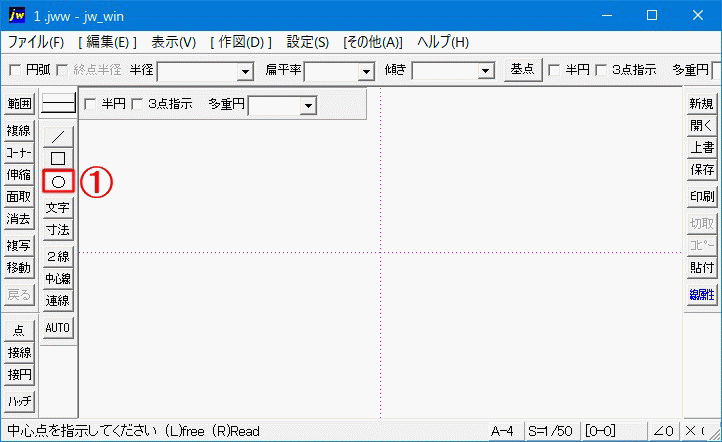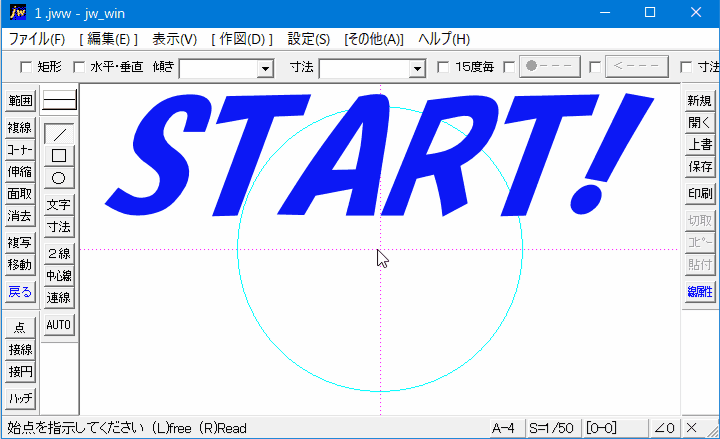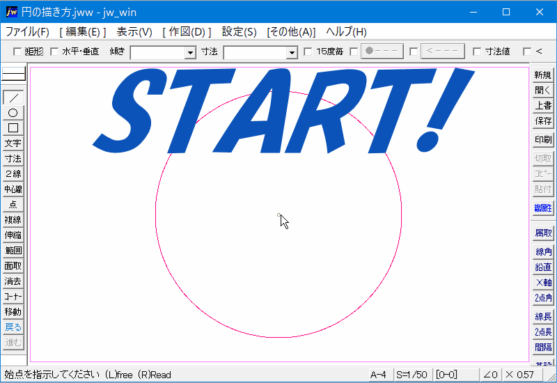 さてこれからJw_cadを実際に使って作図練習を進めさせていただきたいと思います。最初に基本的な円の描き方を練習してみましょう。これが出来なければ、複雑な図面や地図などを描くことは出来ませんので、馬鹿馬鹿しいと思わずに練習してください。それでは早速始めましょう。